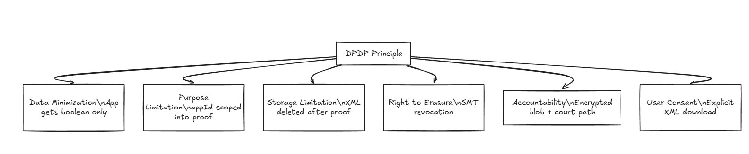 Every Aadhaar Offline XML downloaded from UIDAI is digitally signed by UIDAI’s RSA-2048 private key. Without verifying this inside the circuit, an attacker could craft a fake XML. The first circuit constraint verifies the RSA signature against the hardcoded, public UIDAI key.2. Mandatory Claims