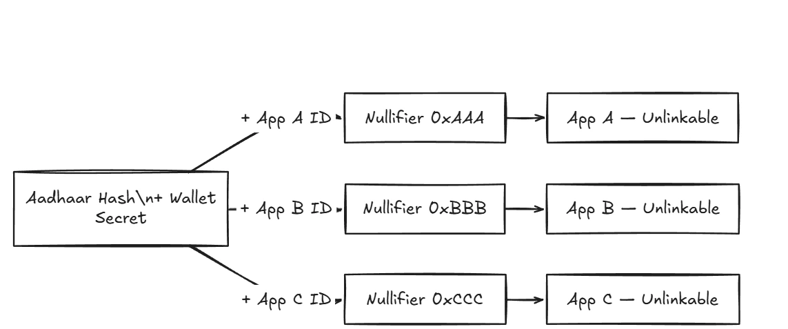 Hash(Aadhaar)) creates a cross-app tracking identifier. An observer could see 0xABC on a DeFi app and 0xABC on an NFT marketplace, linking their activity and destroying privacy.