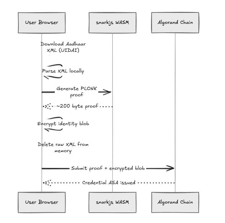 nullifier_hash → wallet_address. Prevents the same Aadhaar from creating multiple credentials for the same app. - Credential ASA: Non-transferable Algorand Standard Asset (ASA) issued to the verified wallet. Clawback enabled exclusively for revocation.