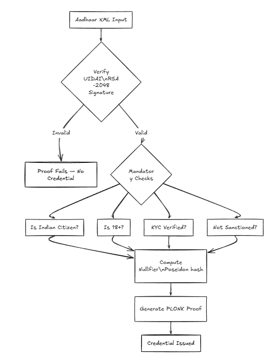 If the signature is valid, the circuit checks the non-negotiable KYC laws:assert nationality == 'IN'assert age(dob, currentDate) >= 18assert kycStatus == VERIFIEDassert SMT.verify(nullifier, merkleRoot, merklePath)